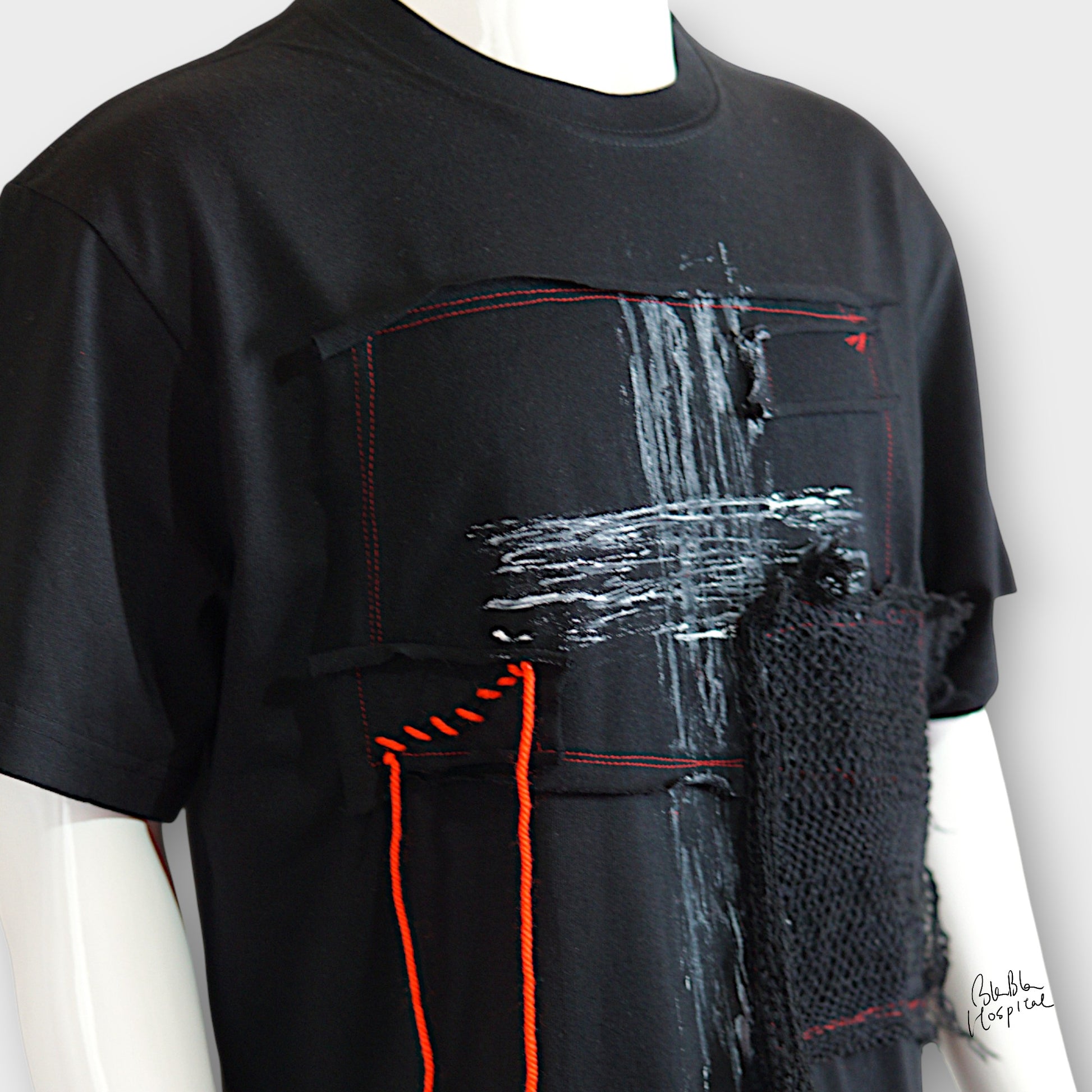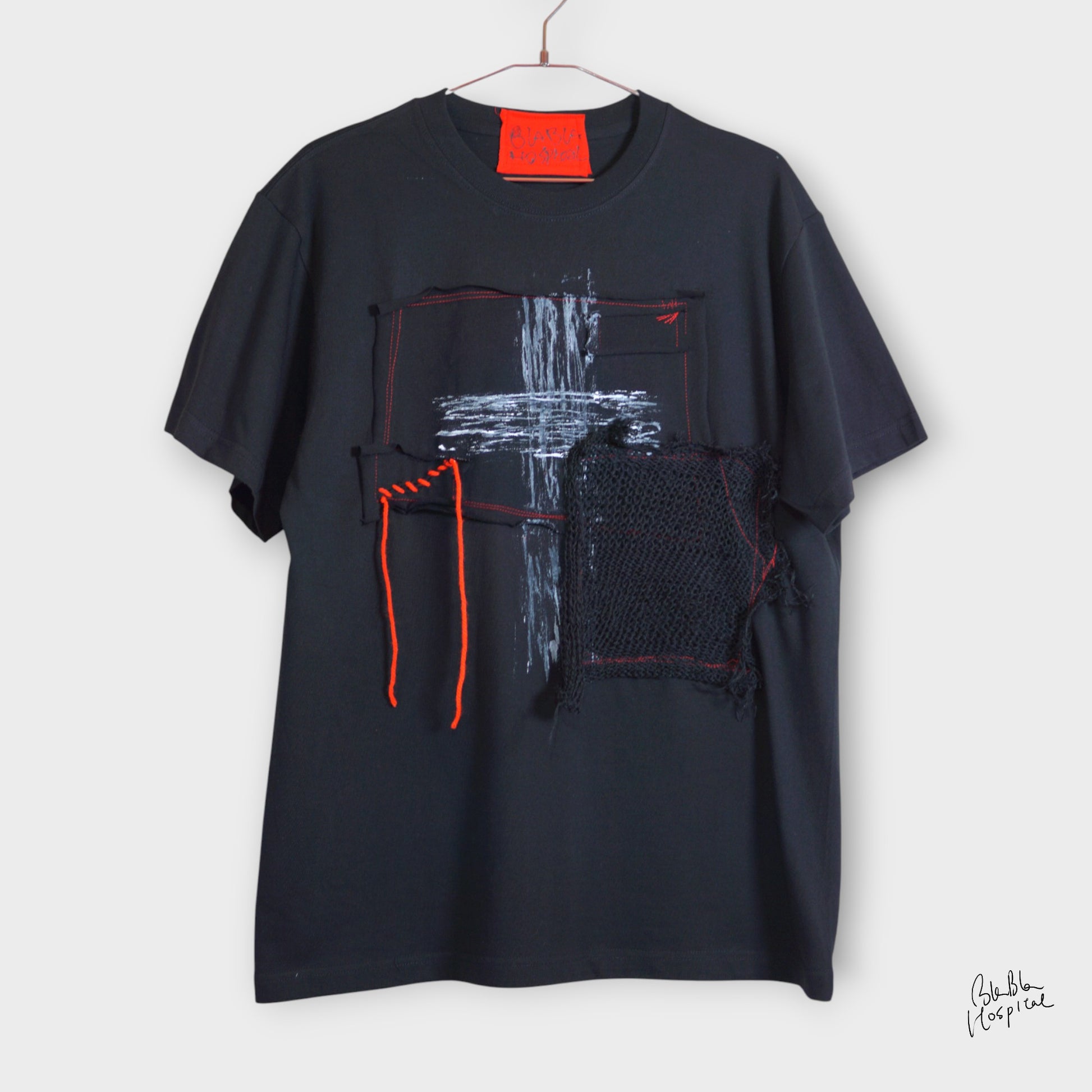 シークレットクロス&アートニットパッチデザイン ブラックTシャツ